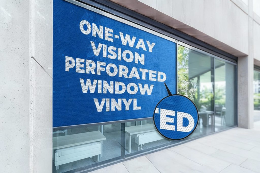 One way window graphics using Contra Vision material for shop windows and offices, offering privacy and promotional visibility.
